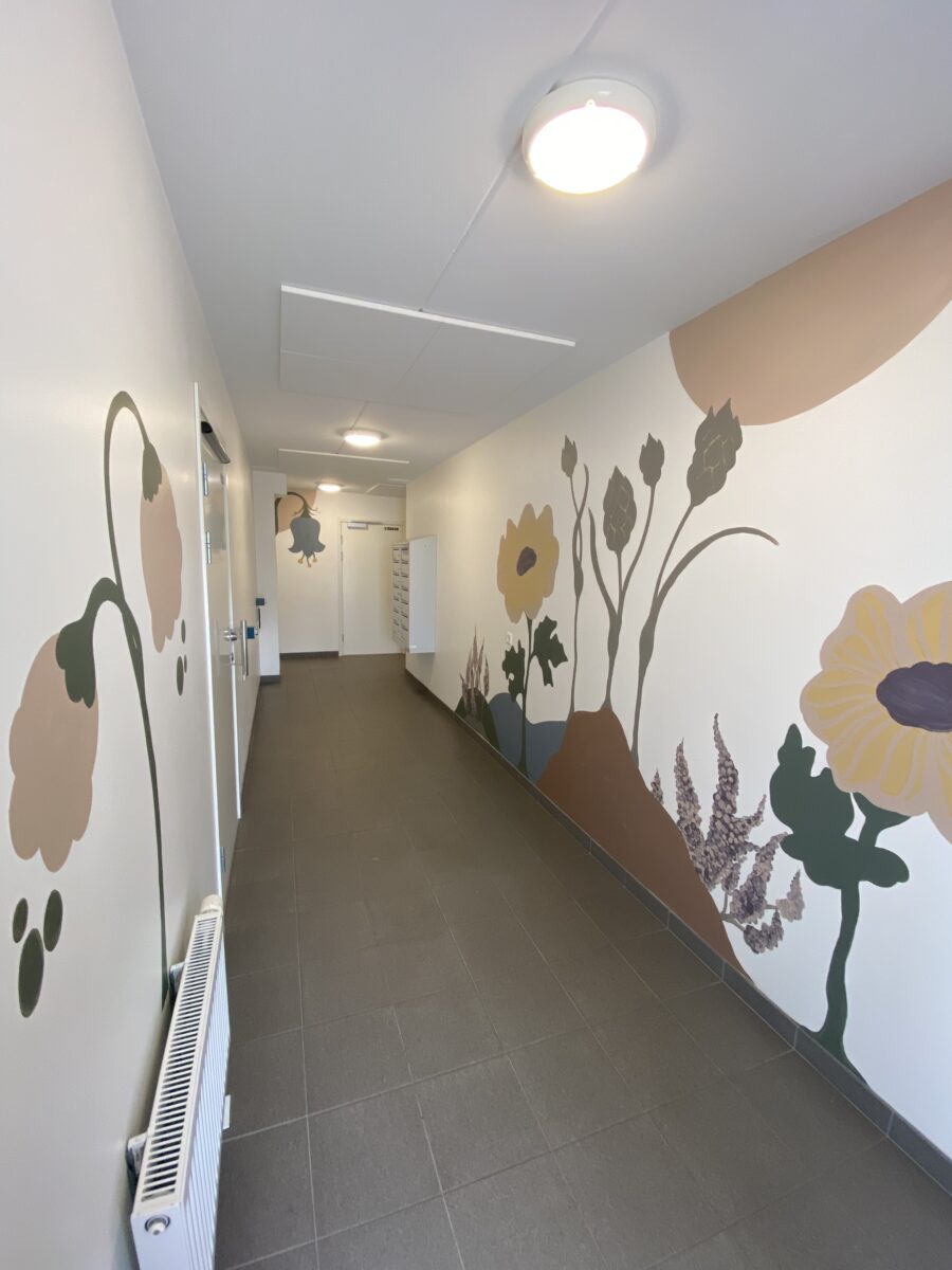 Allt målades för hand med pensel och väggfärg med hyresgästernas välbefinnande i åtanke. Ett härligt projekt med många härliga samtal och pepp från de boende i husen. Tusen tack för förtroendet.